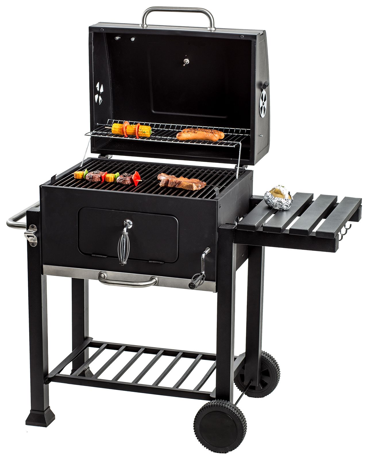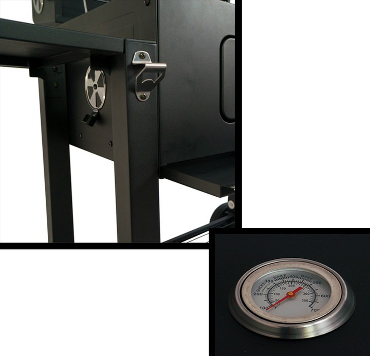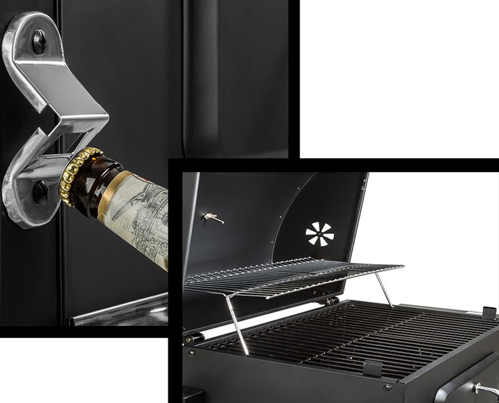 DUŻY GRILL OGRODOWY + 2 PÓŁKI + POPIELNIK + WÓZEK + TERMOMETR + OTWIERACZ DO BUTELEKSpecyfikacja techniczna:
