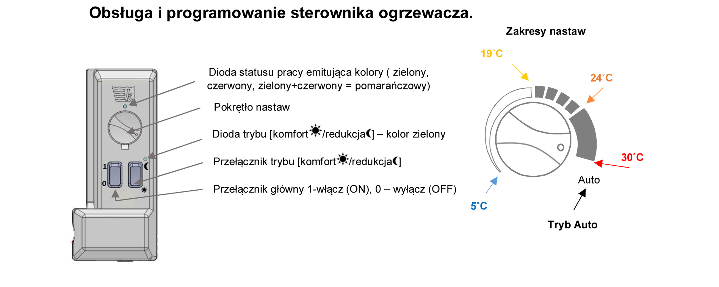 TEL; 603936115 Jest obecnie najczęściej kupowanym grzejnikiem elektrycznym w Polsce. Grzejniki te mogą być zawieszone na ścianie lub wstawiony w specjalnie , dołączone nóżki i przenoszony do różnych pomieszczeń dzięki nowatorskiemu rozwiązaniu sposobu montażu.Elektryczny grzejnik olejowy szybko zapewni wymagany komfort cieplny. Grzejnik jest cichy i bezwonny wytwarza przyjemny mikroklimat.Nie wysusza powietrza , nie spala kurzu, dlatego polecany rodzinom z dziećmi ,osobom starszym, ludziom chorym i osobom z alergiami;jednak świetnie sprawdza się w każdym domu. Oferowany grzejnik przeznaczony jest do domów ,biur, szpitali , magazynów, piwnic oraz przedszkoli i innych pomieszczeń,w których ważne jest utrzymuje czystości i ciepła w pomieszczeniach. Elektryczny ogrzewacz olejowy posiada elektroniczny regulator temperatury , który pozwala precyzyjnie sterować jego pracą. 1) Obsługa w trybie manualnym.Wymaganą temperaturę ustawia się za pomocą pokrętła nastaw w zakresie 5˚C÷30˚C zgodnie z powyższym rysunkiem, oraz za pomocą przełącznika trybu ustawiając go w pozycji komfort * (dioda trybu nie świeci ). Ustawienie przełącznika trybu w pozycję redukcja powoduje, że nastawiona wcześniej temperatura zostanie obniżona o 3,5˚C ( dioda trybu świeci na zielono ). Włącz grzejnik ustawiając przełącznik główny w pozycji 1, ustaw na pokrętle wymaganą temperaturę. Jeśli ustawiona temperatura będzie większa niż temperatura w pomieszczeniu sterownik załączy grzanie co będzie sygnalizować dioda statusu pracy ( kolor zielony – grzałka załączona ). Jeśli grzejnik dogrzeje pomieszczenie do wymaganej temperatury dioda statusu zgaśnie, a sterownik wyłączy grzanie.2) Obsługa w trybie automatycznym.Dokładna instrukcja znajduje się z grzejnikiem.Ustawienia fabryczne sterownika : ustaw pokrętło w trybie „Auto”, a przełącznik trybu w pozycje komfort . Włącz sterownik przełącznikiem głównym ( poz. 1 ) - dioda statusu pracy zacznie szybko mrugać kolorem pomarańczowym i gdy tryb „Auto” zostanie wczytany zgaśnie. Sterownik ustawi się na wartości fabryczne : komfort =19˚C, redukcja =15,5˚C Zgodnie z algorytmem : redukcja = komfort - 3,5˚C Przy ustawieniu przełącznika trybu w pozycji komfort dioda trybu zaświeca się na kolor zielony co 6-stą sekundę. ( przy wczytywaniu się trybu dioda statusu pracy miga szybko na czerwono ). Przy ustawieniu przełącznika trybu w pozycji redukcja dioda trybu świeci na kolor zielony przez 5s po czym gaśnie na 1s. ( przy wczytywaniu się trybu dioda statusu pracy miga szybko na zielono ). Każda zmiana położenia przełącznika trybu powoduje wczytanie ustawionego po upływie ok. 1 min.Dane Techniczne: Moc 1250 W Napięcie zasilania 220~230 ( 50 Hz) Szerokość 1380 mm Wysokość 600 mm Głębokość 80 mm Kolor śnieżnobiały Elektroniczny regulator temperatury Termostat elektroniczny Waga 21 kg
