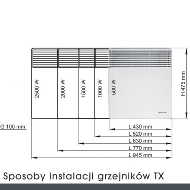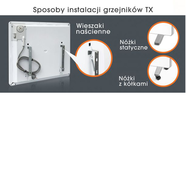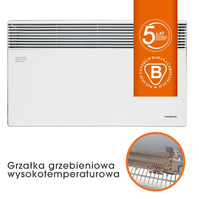 Grzejniki marki THERMOVAL seria TX - z grzałką grzebieniową, wysokotemperaturową. Nowa seria grzejników konwektorowych THERMOVAL to nowoczesne i niezawodne rozwiązanie w zakresie elektrycznego ogrzewania pomieszczeń.Grzejniki w procesie grzania wykorzystują zjawisko konwekcji powietrza, wymuszonego obiegu zwanego również „efektem kominowym”. Grzejniki serii TX wykonane są z tłoczonej blachy stalowej powlekanej powłoką antykorozyjną i lakierem piecowym odpornym na wysokie temperatury. Kształt lameli wylotu powietrza pozwala na łagodne rozprowadzenie ciepła po ogrzewanym pomieszczeniu. Posiadają przełącznik włącz/wyłącz. Elementem grzejnym w modelu TX jest grzałka grzebieniowa a nad właściwą pracą urządzenia czuwa termostat umożliwiający ustawienie 8 różnych nastaw temperatury oraz posiadający funkcję zabezpieczającą grzejnik przed przemarznięciem. Z termostatem współpracuje czujnik temperatury otaczającego powietrza. Model TX jest grzejnikiem podstawowej konstrukcji, zaprojektowanym z przeznaczeniem do instalacji w pomieszczeniach mieszkalnych i biurowych. moc elementu grzejnego 2500 Wzasilanie ~ 230 V element grzejny - grzałka grzebieniowa obudowa- blacha stalowa, powlekana element sterujący- automatyczny termostat przełącznik włącz/wyłącz ilość pozycji nastaw temperatury - 8 funkcja przeciwzamrożeniowa przewód zasilający z wtyczką- instalacja na wieszakach naściennych możliwość instalacji na nóżkach ( nóżki nie są w komlecie) stopień ochrony- IP 20 Polski atest PCBC gwarancja na element grzewczy- 5 lat zabezpieczenie przed przegrzaniem obudowa: blacha stalowa powlekana powłoką antykorozyjną lakier piecowy odporny na wysokie temperatury grzejnik konwekcyjny przewód zasilający 1,5m zakończony wtyczką instrukcja montażu uchwyty do zamontowania na ścianie karta gwarancyjna (gwarancja 24 miesiące, element grzejny 5 lat)dokument sprzedaży
